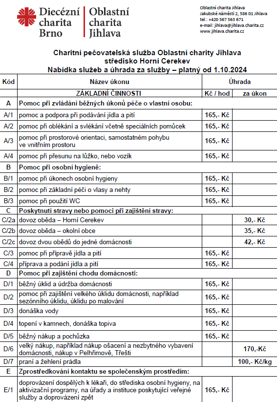 - Charitní pečovatelská služba Horní Cerekev, Sportovní 500, 394 03 Horní Cerekev, tel. 703 404 362, e-mail: hornicerekev@jihlava.charita.cz,