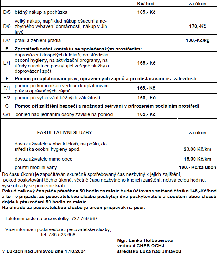 - vedoucí CHPS – Lenka Hofbauerová, Nová 730, Luka n/J tel. 736 523 658, e-mail: lenka.hofbauerova@jihlava.charita.cz