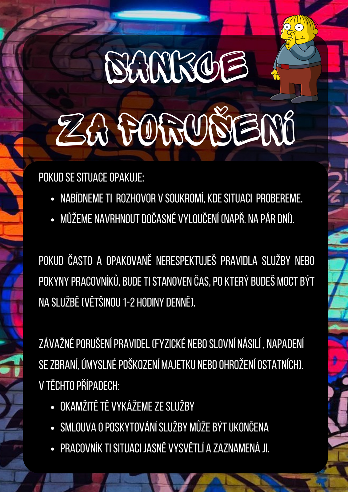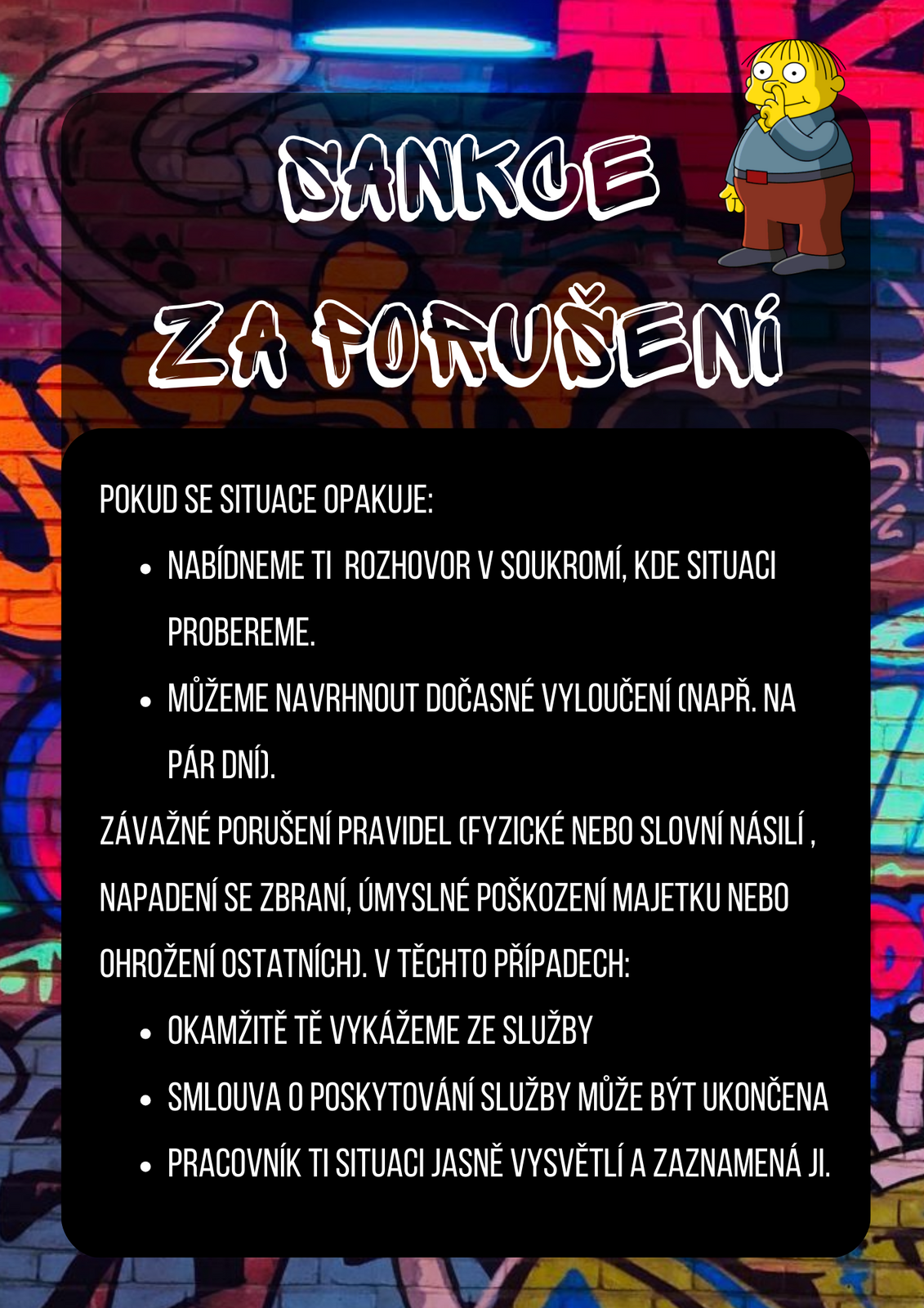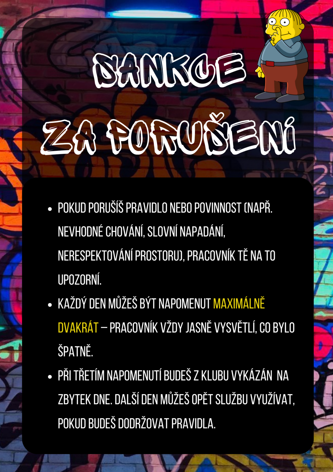 - Pokud klient porušuje pravidla nebo povinnosti opakovaně a pracovník jej musí často řešit, nabídne klientovi rozhovor v soukromí, blíže s ním rozebere situaci nebo jej rovnou vykáže z klubu na delší čas. O délce trvání rozhodnou pracovníci na poradě.