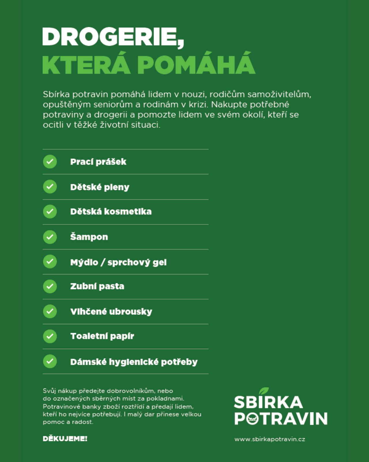 Sbírka potravin je dnem solidarity, při kterém může každý pomoci tím nejjednodušším způsobem, darem trvanlivých potravin a drogerie.